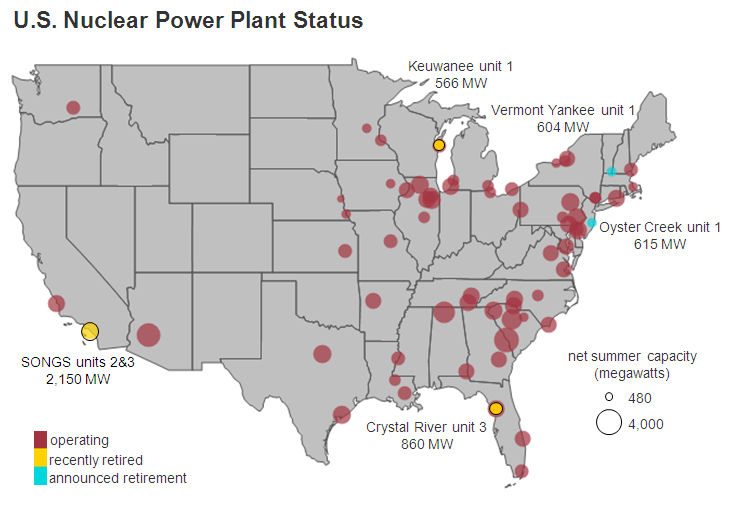 The closure of the Vermont Yankee plant in December 2014 follows the retirement of four nuclear units in 2013. The five shuttered reactors aggregate 4.2 gigawatts (GW). A sixth reactor, the 615-MW Oyster Creek unit, will be retired by Dec. 31, 2019. Five of the six units are retiring before the expiration of their operating licenses.