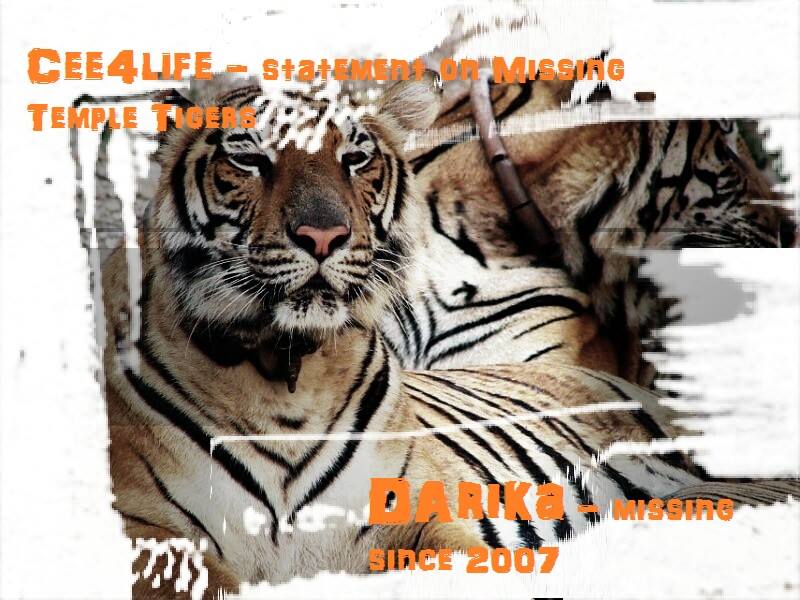 This news is based on Cee4life statement regarding the raids and confiscations of illegally kept animals on the premises of Tiger Temple at Kanchanaburi in Thailand, followed by the further recent revelations of the Tiger Temple Veterinarian of 15 years regarding the disappearance of 3 Tigers, Dao Nau, Facram 3 and Happy 2.