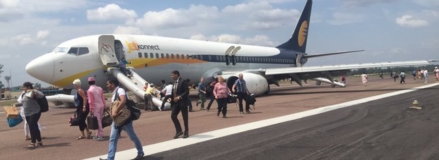 Bhopal: Jet Airways flight 9W2423 with 59 passengers and 8 crew members on board develops snag in landing gear upon landing at the Khajuraho airport in the Central Indian State of Madhya Pradesh on Monday afternoon.