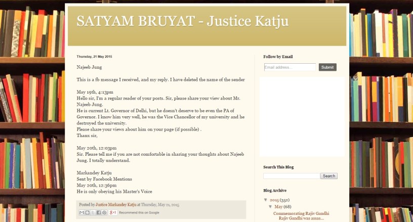 Katju blogNew Delhi: On the raging row between Delhi’s Lieutenant Governor Najeeb Jung and elected Chief Minister Arvind Kejriwal, Justice Markandey Katju, the former Chairman, Press Council of India and prior to that a Judge at the Supreme Court of India, has stated on his blog that “He (Najeeb Jung) is only obeying his Master’s Voice”.