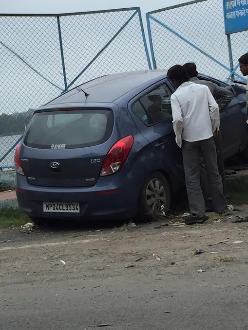 So the I 20 gained momentum while passing by the Shahpura lake, overtook a biker easily, strategy being – hitting the bike bumper to bumper, then keeping pace with the recklessness, zoomed ahead and banged into the railing which has actually been provided as a safety fence along the sides of the lake,