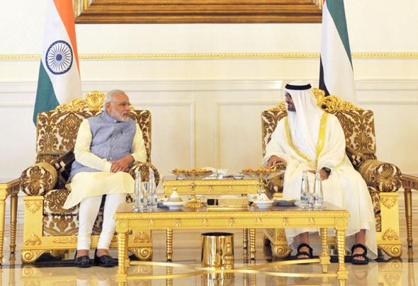 Abu Dhabi: Prime Minister Narendra Modi, who arrived here on a two-day tour of UAE on Sunday, was received by the Crown Prince of Abu Dhabi, His Highness Sheikh Mohammed bin Zayed Al Nahyan on his arrival at Abu Dhabi Airport on August 16.