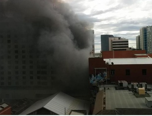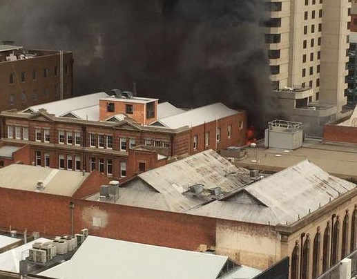 Adelaide, South Australia : Fire ripped through two buildings adjacent to the large Hotel Grand Chancellor, in the center of Adelaide city and caused panic among hundreds of people in the CBD vicinity, forcing immediate evacuation and rescue measures. Large areas of the CBD including Hindley Street were immediately closed down and every single person was rushed out as dark fumes of burning flames filled the entire skyline with smoke and worry.