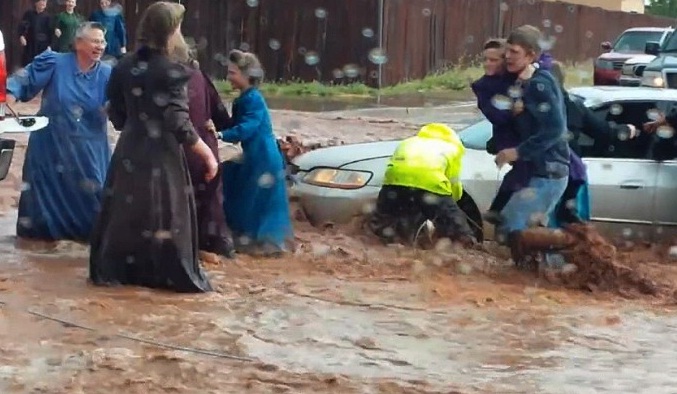 Hildale, Utah : Flash flood swept away lives and vehicles when a canyon river near Utah-Arizona border gushed in water, resulting in two vehicles carrying women and children floating for rescue, leaving 12 persons dead and one person missing. Among the killed were at least six children and three women, according to Utah officials in the city of Hildale and Washington County Emergency Services. The two vehicles carried a total of 16 women and children after a visit to a park in the mishap zone. A boy along with two elders miraculously survived the flash flood. Two others survived by escaping from their vehicle.