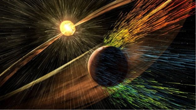 From a scientific perspective, the overall process is such – the Sun emits a constant stream of charged particles called the solar wind. This wind carries magnetic fields. When these solar winds hit the planet, they build up a capacity and generate electric fields that are then able to accelerate atmospheric ions. these ions hurl the solar winds and propel them either directly off into space, or deviate their direction by slamming them into other atmospheric constituents so that they are removed. Although the magnitude of loss rates due to the direct or tangent movement of propelling of these solar winds may appear on the face of it to be quite small, yet the impact of these hurls are large enough and significant on their thrust impact in a consolidated built-up manner — when applied over the 4.5 billion years of Mars’ history.