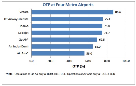 for four metro airports viz. Bangalore, Delhi, Hyderabad and Mumbai. Airline-wise OTP