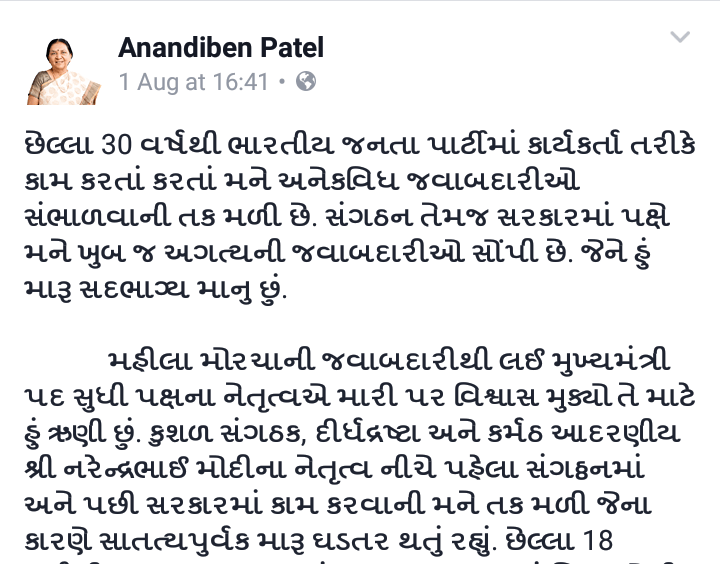 Gandhinagar: Gujarat Chief Minister Anandiben Patel yesterday afternoon posted her resignation on facebook.