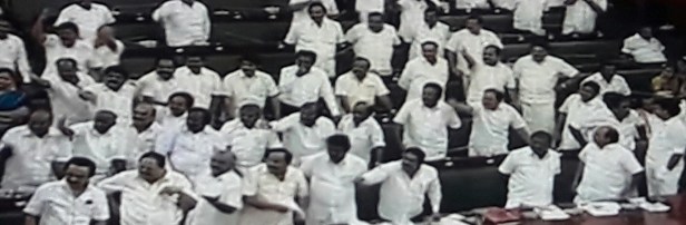 The Speaker ordered the eviction of all the DMK MLAs present when the DMK Members lost control and lodged a loud protest after ruling AIADMK MLAs took a dig at DMK leader MK Stallin for his “Namakku Naame” campaign ahead of the Assembly polls across all 234 assembly constituencies that failed to bring electoral dividends for his party.