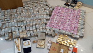 Bengaluru: During a search and seizure operation, 28 kg of bullion, ₹5.7 Cr of new currency notes and ₹ 90 lakhs in old ₹100 and 20 notes was seized from a secret locker in the bathroom of a hawala operator’s residence at Chalakkare, a small town in Chitradurga District.