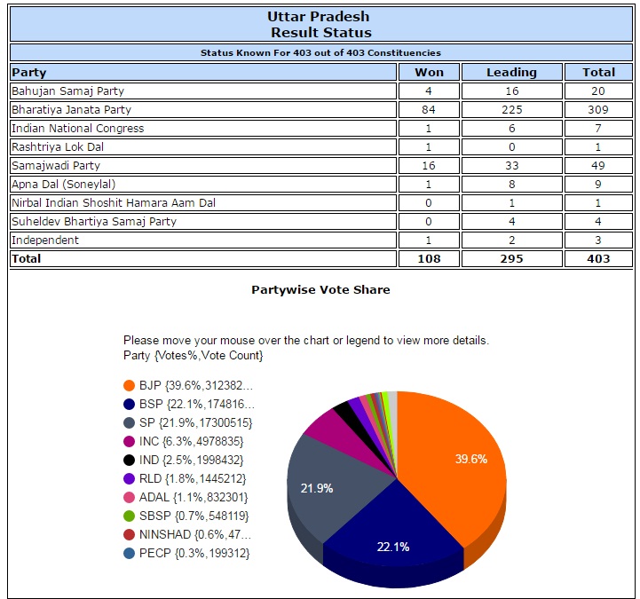 New Delh: Bharatiya Janata Party has swept the Uttar Pradesh Assembly election by registering a landslide victory in the hindi heartland and demolishing all claims by the outgoing chief minister Akhilesh Yadav that his party’s alliance with the Congress will return to power and if necessary they would do this by cobbling a majority by taking support from Mayawati’s Bahujan Samaj Party.