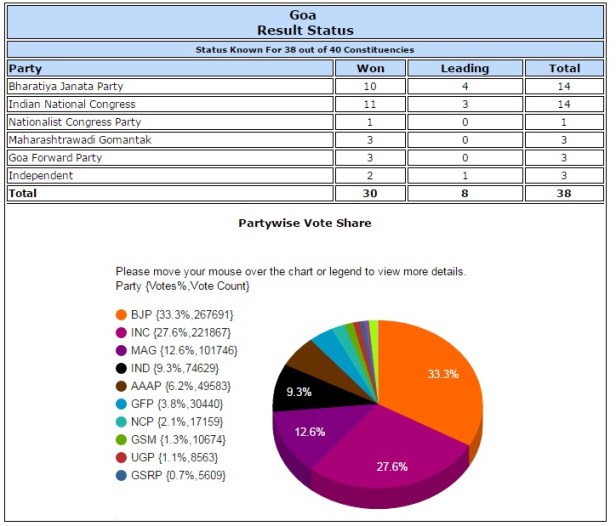 In Goa the Congress and ruling BJP were neck to neck when results for 7 of the 40 seats were still awaited.