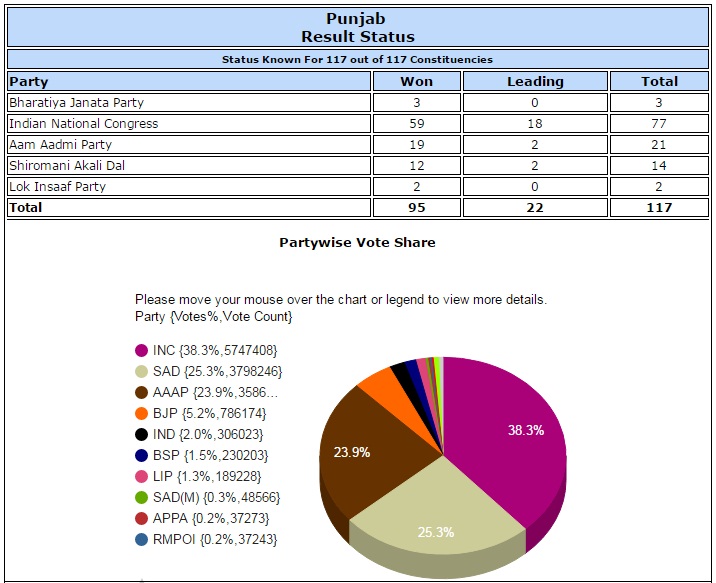 In Punjab the story has been entirely different. Here the Shiromani Akali Dal-BJP alliance has been trounced by the Congress. The Aam Aadmi Party in its maiden foray in this state, has emerged as the second largest party with BJP placed in the fourth place.