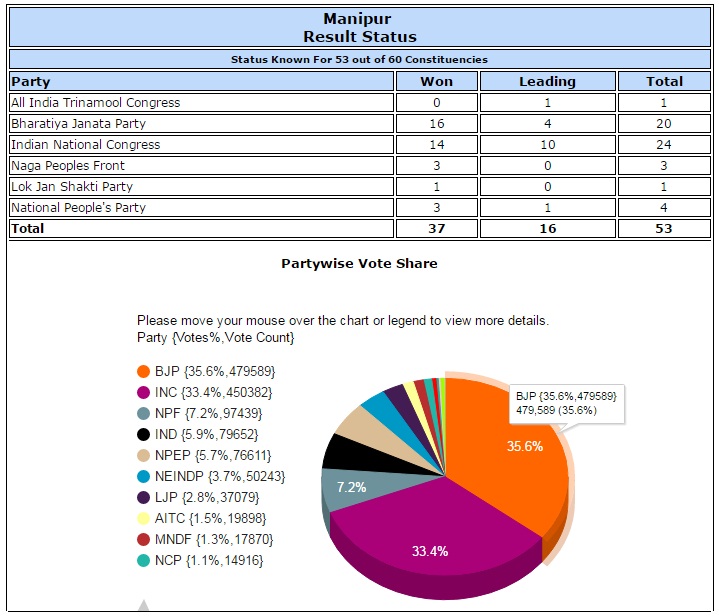 In Manipur, the Congress and BJP were neck to neck with 15 of the 60 results awaited this afternoon.