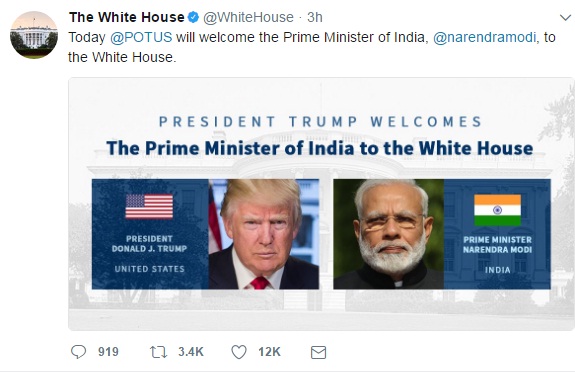 Today @POTUS will welcome the Prime Minister of India, @narendramodi, to the White House. pic.twitter.com/MIi1ifmdAN