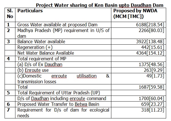 The Madhya Pradesh Chief Secretary has also drawn Government of India’s attention to the Minutes of Meeting of the Chief Minister of Madhya Pradesh and Uttar Pradesh held in January 1977. In this meeting, it was agreed that Uttar Pradesh will not increase its irrigation from Ken Canal beyond 2.10 Lakh acres during kharif and 1.60 Lakh acres during rabi. Therefore, it has been underscored by the chief Secretary that the total CCA of UP including the enroute CCA of 13,763 ha cannot exceed 97,763 ha. whereas the draft cabinet note mentions 2,22,373 ha. CCA in UP. Taking off from this argument, Madhya Pradesh Government has urged the Centre to direct National Water Development Authority (NWDA) to incorporate suitable changes in the DPR.