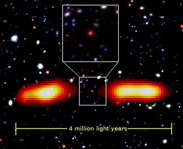 Super massive black hole – typically with mass ranging from one crore to hundred crore mass of the sun- is at the center of the GRGs. Acting as the `central engine’, this black hole drives the dynamics of the GRGs. All the materials in the vicinity are sucked by the incredible gravity of the super massive black hole. As the materials fall inward, they become ionised and this motion of the charged materials create powerful electromagnetic force, which in turn blast away the materials at the edges. The jets of hot plasma blasting away from the black hole in opposite directions produce huge lobes of radio emissions that can span much greater distances than the galaxy’s visible light.
