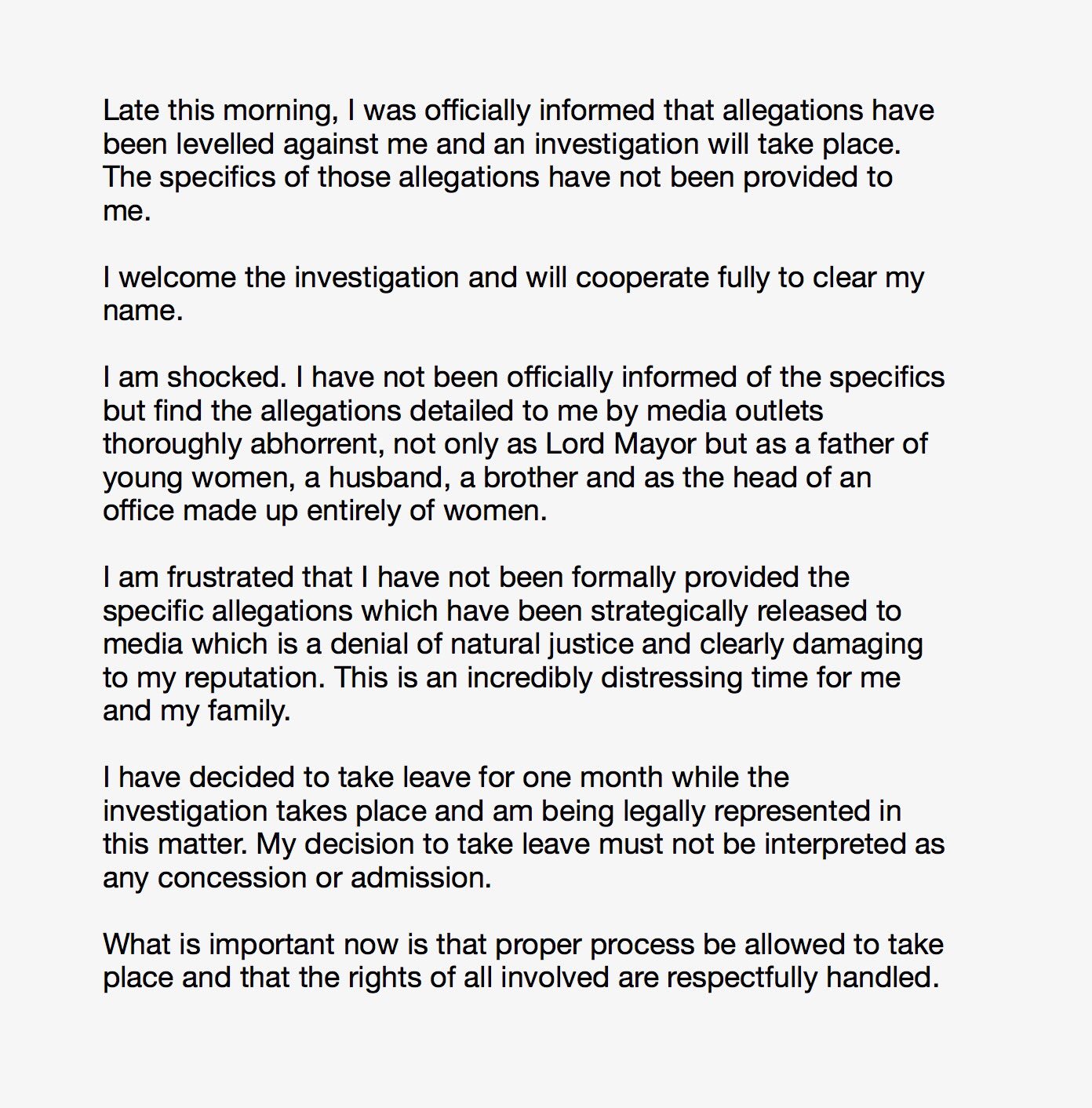In a statement on Twitter, Cr Doyle said he was shocked by the allegations,. He has further said that he had not officially been informed of the specifics and would take a month's leave.