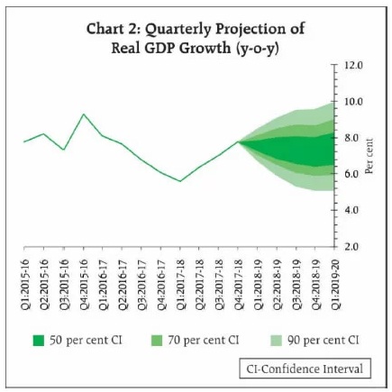 15. Turning to the growth outlook, various indicators suggest that economic activity has continued to be strong. The progress of the monsoon so far and a sharper than the usual increase in MSPs of kharif crops are expected to boost rural demand by raising farmers’ income. Robust corporate earnings, especially of fast moving consumer goods (FMCG) companies, also reflect buoyant rural demand. Investment activity remains firm even as there has been some tightening of financing conditions in the recent period. Increased FDI flows in recent months and continued buoyant domestic capital market conditions bode well for investment activity. The Reserve Bank’s IOS indicates that activity in the manufacturing sector is expected to remain robust in Q2, though there may be some moderation in pace. Rising trade tensions may, however, have an adverse impact on India’s exports. Based on an overall assessment, GDP growth projection for 2018-19 is retained, as in the June statement, at 7.4 per cent, ranging 7.5-7.6 per cent in H1 and 7.3-7.4 per cent in H2, with risks evenly balanced; GDP growth for Q1:2019-20 is projected at 7.5 per cent (Chart 2).