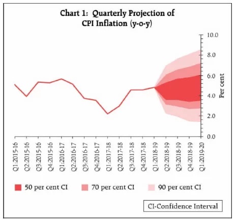 14. The inflation outlook is likely to be shaped by several factors. First, the central government has decided to fix the minimum support prices (MSPs) of at least 150 per cent of the cost of production for all kharif crops for the sowing season of 2018-19. This increase in MSPs for kharif crops, which is much larger than the average increase seen in the past few years, will have a direct impact on food inflation and second round effects on headline inflation. A part of the increase in MSPs based on historical trends was already included in the June baseline projections. As such, only the incremental increase in MSPs over the average increase in the past will impact inflation projections. However, there is a considerable uncertainty and the exact impact would depend on the nature and scale of the government’s procurement operations. Second, the overall performance of the monsoon so far augurs well for food inflation in the medium-term. Third, crude oil prices have moderated slightly, but remain at elevated levels. Fourth, the central government has reduced Goods and Services Tax (GST) rates on several goods and services. This will have some direct moderating impact on inflation, provided there is a pass-through of reduced GST rates to retail consumers. Fifth, inflation in items excluding food and fuel has been broad-based and has risen significantly in recent months, reflecting greater pass-through of rising input costs and improving demand conditions. Finally, financial markets continue to be volatile. Based on an assessment of the above-mentioned factors, inflation is projected at 4.6 per cent in Q2, 4.8 per cent in H2 of 2018-19 and 5.0 per cent in Q1:2019-20, with risks evenly balanced (Chart 1). Excluding the HRA impact, CPI inflation is projected at 4.4 per cent in Q2, 4.7-4.8 per cent in H2 and 5.0 per cent in Q1:2019-20.