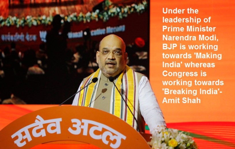 New Delhi: Ruling Bharatiya Janata Party President Amit Shah was at his caustic best today when he took a jibe at the main Opposition Congress by stating that under the leadership of Prime Minister Narendra Modi, BJP is working towards ‘Making India’ whereas Congress is working towards ‘Breaking India’