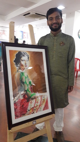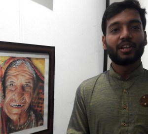 Rishabh excells when it comes to coloured charcoal portrait drawings. The eyes in some paintings seem to follow you….the Mona Lisa painting with eyes that follow is a famous example. Rishabh’s stunningly beautiful portrait of a lady in a colourful sari with a sideways glance that never leaves you was the centre piece and a show stopper at this exhibition.
