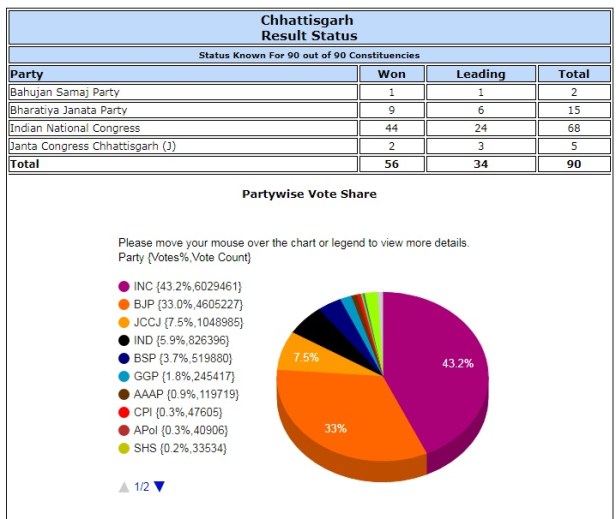 Congress party has hit the jackpot in the Hindi heartland by sweeping the Assembly election in Chhattisgarh, establishing a formidable lead over the Bharatiya Janata Party in Rajasthan and emerging as the largest party in Madhya Pradesh.