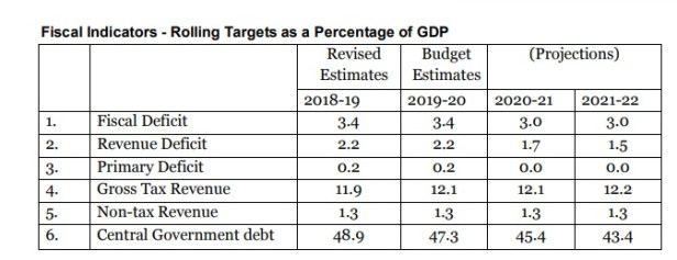 Primary Deficit is another indicator which has been included in the Medium term fiscal policy statement from 2019-20. Primary deficit refers to the deficit left after subtracting interest payments from fiscal deficit. In BE 2018-19, primary deficit was calculated to be Rs.48,481 crore which is 0.3 per cent of GDP. Primary deficit in RE 2018-19 is expected to be Rs.46,828 crore which works out to be 0.2 per cent of the GDP. The reduction of primary deficit is a positive sign as it shows reduced usage of borrowed funds to pay for existing liabilities.