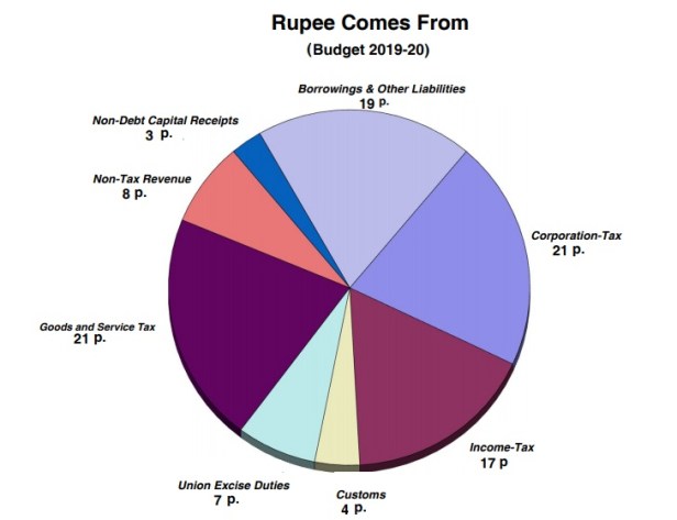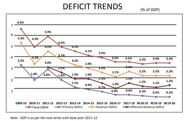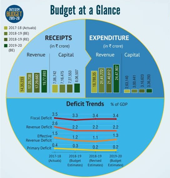 In all the total expenditure is to increase from Rs.24,57,235 crore in 2018-19 RE to Rs.27,84,200 crore in 2019-20 BE. A rise of Rs.3,26,965 crore or approximately 13.30%. This reflects a high increase considering low inflation. The fiscal deficit of year 2019-20 is estimated to be 3.4% of GDP.