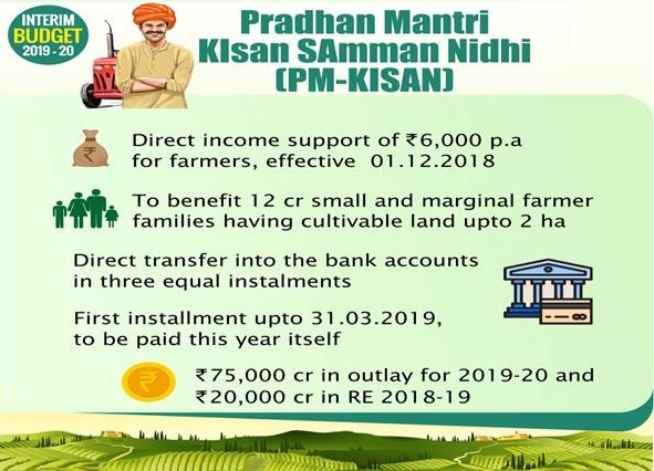 New Scheme- namely “Pradhan Mantri Kisan Samman Nidhi (PM-KISAN)” to extend direct income support at the rate of Rs. 6,000 per year to farmer families, having cultivable land upto 2 hectares is announced.