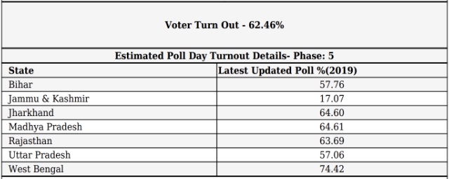India Fifth phase of poll: By and large peaceful; 62.50% voter turnout Date: May 6, 2019Author: Editor 0 Comments Newsroom24x7 Network New Delhi: During the Fifth Phase of polling today 6 May 2019, the estimated voter turnout as reported till 8.15 pm was 62.46 per cent. Share this: Share on X (Opens in new window) X Share on Facebook (Opens in new window) Facebook Like Loading... Related