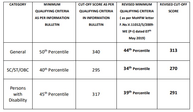 In accordance with Ministry of Health & Family Welfare, Government of India letter F.No.V.11012/5/2009-ME (P-I) of 7 May 2019, the minimum qualifying percentiles have been lowered as follows: