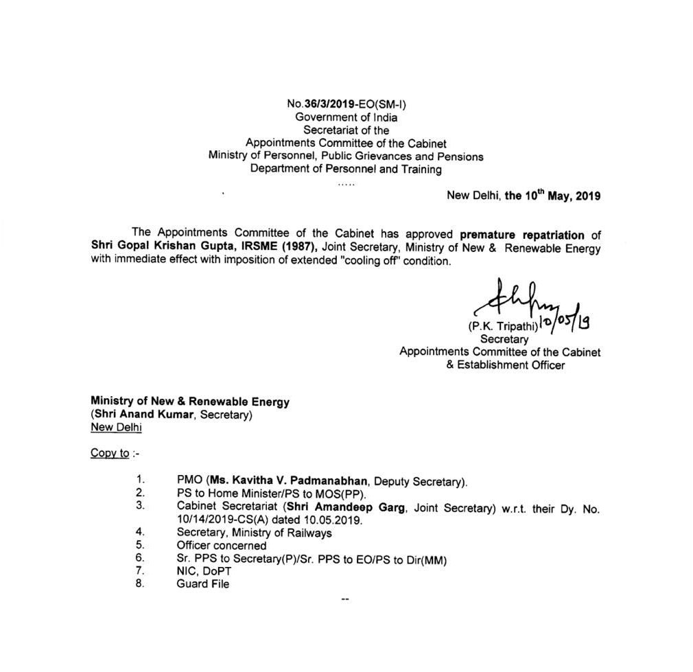 On 10 May, the appointments Committee of the Cabinet approved the premature repatriation of Gupta with immediate effect with imposition of extended “cooling off” condition.