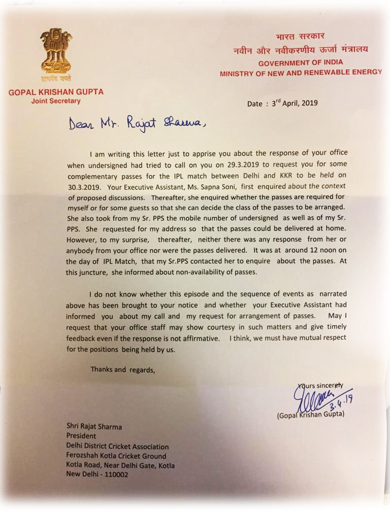 Gupta wrote to Rajat Sharma, President Delhi District Cricket Association, on his official letter head on 3 April 2019, bringing to his notice that he had tried calling him on 29 March to request for “some complementary passes” for the IPL match the next day.