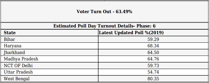 New Delhi: In the sixth phase of polling, West Bengal, where maximum complaints of poll-related violence, intimidation of voters and attempts of booth rigging were received, registered the maximum 80.35% polling.