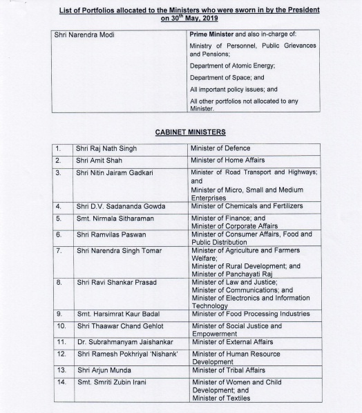 New Delhi: Bharatiya Janata Party President Amit Shah is the new Home Minister of India. Raj Nath Singh gets Defence, Nitin Gadkari gets the Road Transport and Highways and Micro, Small and Medium Enterprises portfolios.