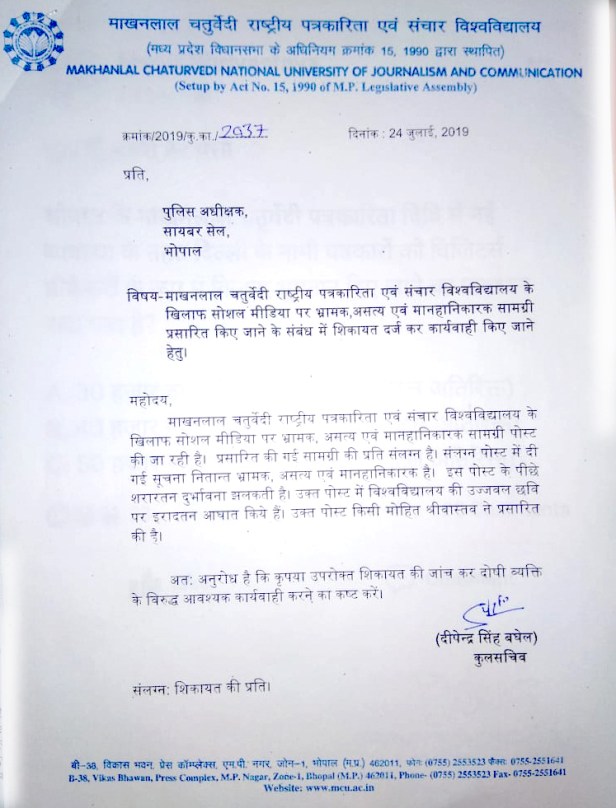 Bhopal: A complaint has been filed in the cyber cell of the police here regarding an objectionable post on social media that targets the Makhanlal Chaturvedi National University of Journalism and Communication by hurling baseless and false charges.