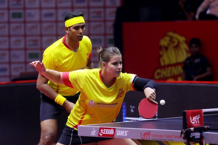 PETRISSA SOLJA of Team Chennai Lions and ACHANTA SHARATH KAMAL of Team Chennai Lions in action during the semi Final 2 match of the Ultimate Table Tennis League played between Team Chennai Lions and Team Goa Challengers at Thayagraj Stadium in Delhi, India on 10th August 2019. Photo : Sandeep Shetty / Focus Sports / Ultimate Table Tennis