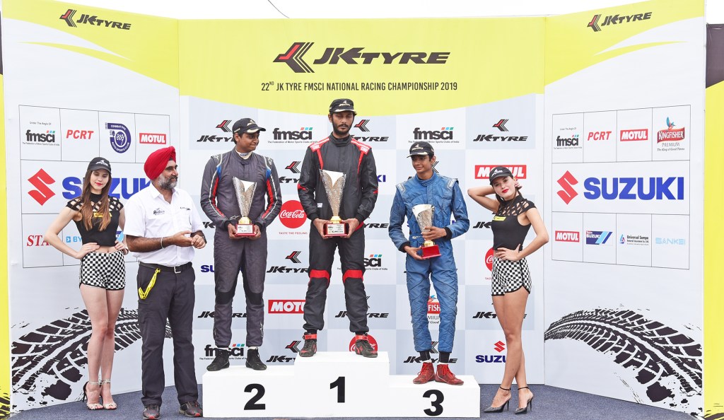 JK Tyre Novice Cup: (15 laps)Race 3: 1. Aaroh Ravindra (Mumbai; 18:19.30); 2. Chirag Ghorpade (Bangalore; 18:24.87); 3. Mohamed Ryan (Chennai; 18:29.31)