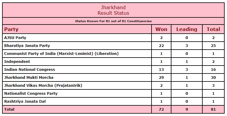 The ruling Bharatiya Janata Party has emerged as the second largest party in a house of 81. The State Governor has asked outgoing Chief Minister Raghubar Das to remain as the care taker chief minister till the new government is sworn in.
