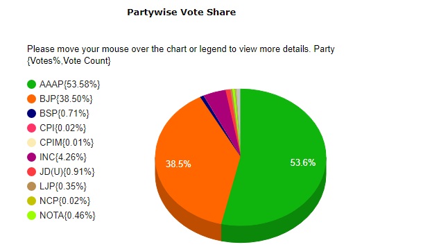AAP, led by party supremo and Delhi Chief Minister Arvind Kejrival has vanquished an entire array of parties including the Congress, which could bag only 4.30 per cent of the popular votes. While AAP got 53.67 per cent of the total votes polled, the Bharatiya Janata Party came second with 38.41 per cent votes. All the other parties, including the BSP, CPI, CPIM, JD(U), and NCP trailed behind with less than 1 per cent votes.