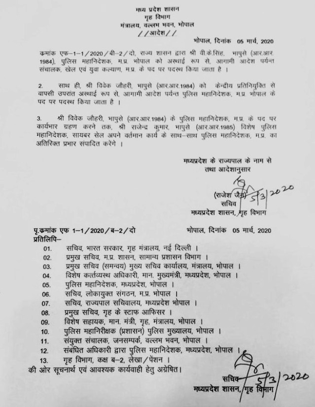 Bhopal: Vivek Johri, IPS 1984, has been appointed as the new Madhya Pradesh Director General of Police.
