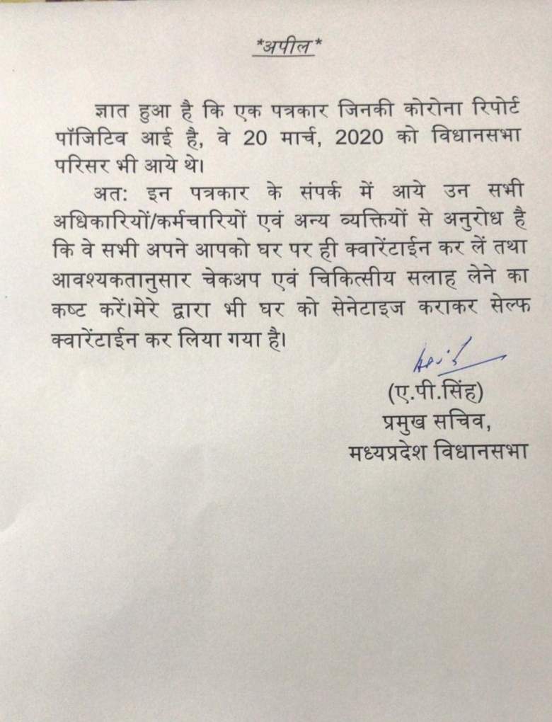 Bhopal: The presence of a particular journalist at the press conference of Kamal Nath just before he submitted his resignation as chief minister on 20 March has sent state authorities and the press fraternity in the state capital in a spin as both the journalist concerned and his daughter, who has returned recently from London after completing her post-graduation in Law, have tested positive for COVID19.