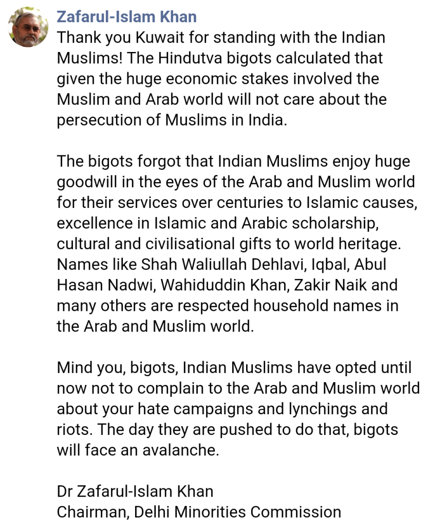 Look at poor Zafarul and his unfortunate rant. He is 72, is the son of a very privileged family, yet when he wants to seek justice, the only thing he can think of is the Arabs intervening in India. He can’t even imagine himself, his Muslim friends, standing up and telling those who are ill treating them to not do so. After all, when they do make that statement they will have to actually spell out the nature of the ill treatment. And, surprisingly, there is none.