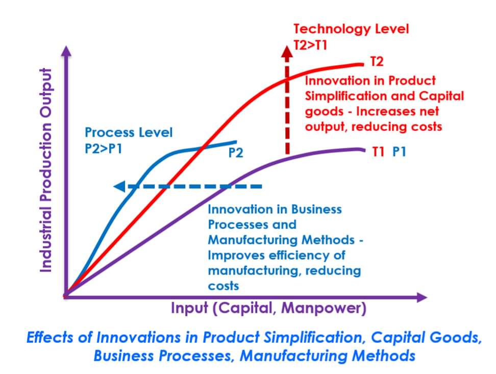 Every industry will come to a saturation point in terms of product output. Even by increasing the input resources in terms of capital and manpower, there will be hardly any increase in the output beyond saturation point. Innovation brings about a change in the stalemate scenario by making it more productive or more efficient or both. Kindly see the figure: