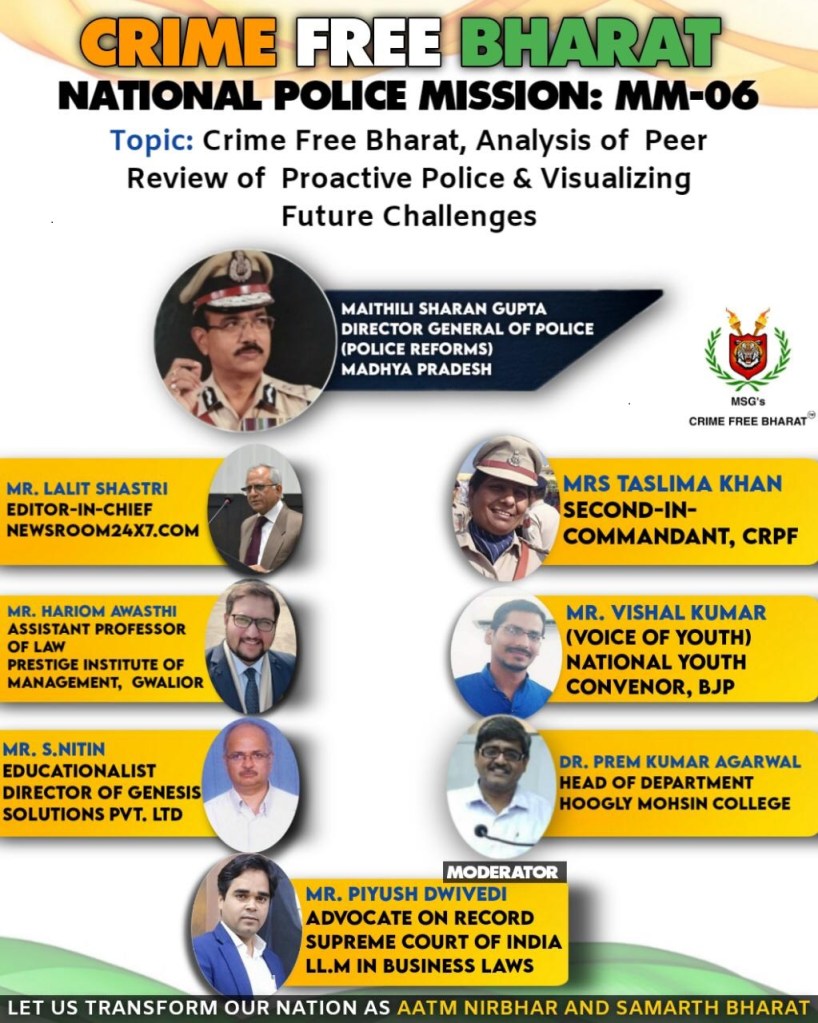 Besides Maithili Sharan Gupta, Madhya Pradesh DGP (Police Reforms), the other experts joining the Monday 27 July webinar, are Lalit Shastri, Editor-in-Chief Newsroom24x7; Ms. Khan, Second-in Commandant, CRPF; Hariom Awasthy, Asst. Professor of Law, Prestige Institute of Management, Gwalior; Vishal Kumar, National Convener, Voice of Youth; S Nitin, Educationist, Director of Genesis Solutions Pvt. Ltd.; Dr Prem Kumar Agarwal, Head of Department of Hoogly Mohsin College. Click here to join this webinar