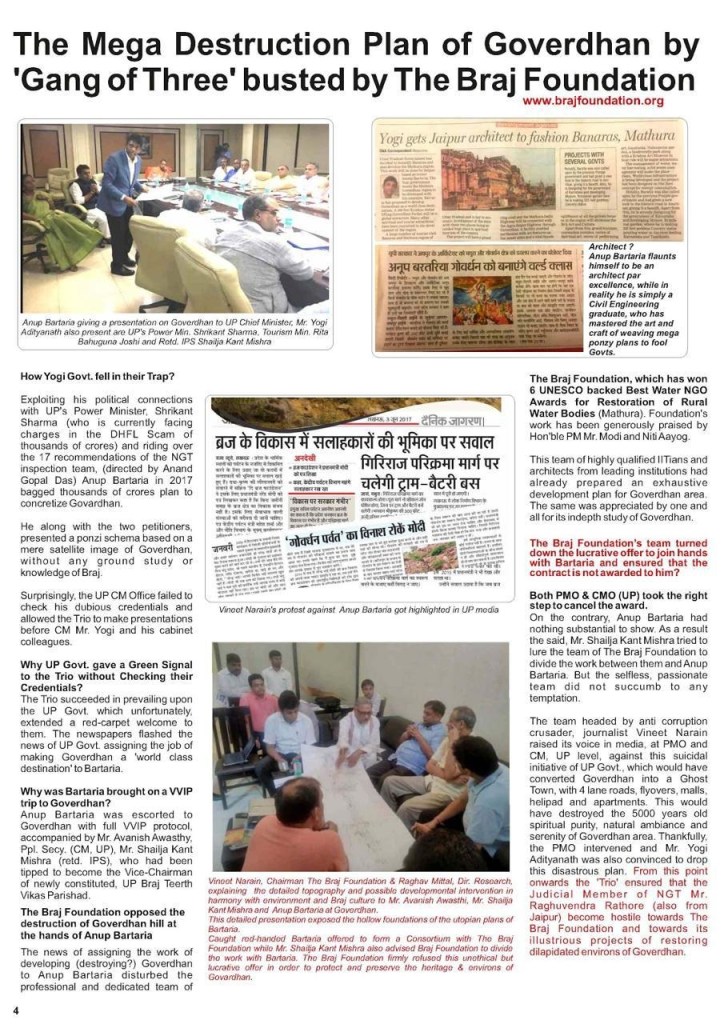 18. He began his Braj initiative by organising a Red Carpet Welcome before the Yogi Govt.for a well known scam master of Jaipur (under the net of ED & CBI for major financial frauds) Anup Bartariya and got him the job of developing Goverdhan Hill. When we opposed this, Satya Prakash Mangal became petitioner in NGT against us and filed all false charges to stop us from serving Braj.