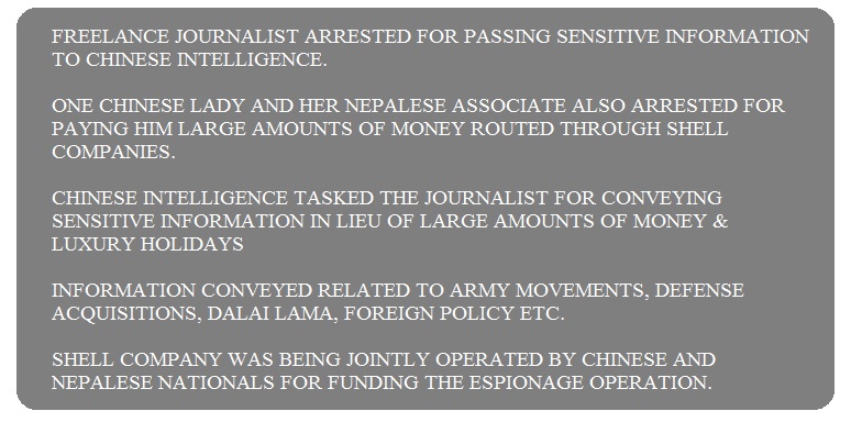 Further, during his police custody remand, a Chinese woman Qing Shi and her Nepalese partner Sher Singh alias Raj Bohra have been also arrested. They were found supplying Sharma huge amounts of money routed through Hawala Channels for conveying sensitive information to Chinese Intelligence.