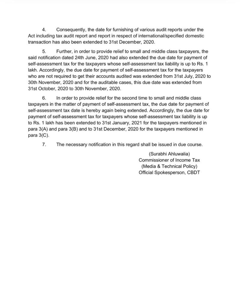 In order to provide relief for the second time to small and middle class taxpayers in the matter of payment of self-assessment tax, the due date for payment of sell-assessment tax date is hereby again being extended. Accordingly, the due date for payment of self-assessment tax for taxpayers whose self-assessment tax liability is up to Rs. 1 lakh has been extended to 31st January, 2021.