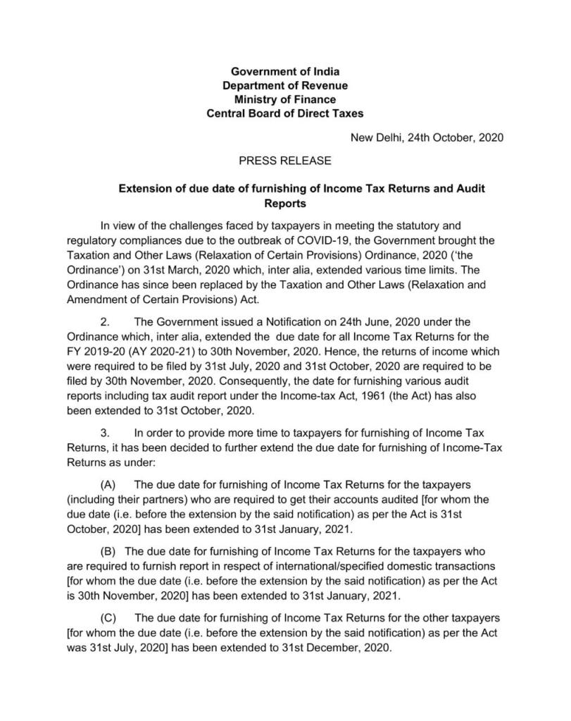 New Delhi: The due date for furnishing of Income Tax Returns for the taxpayers (including their partners) who are required to get their accounts audited (for whom the due date (ie, before the extension by the said notification) as per the Act is 31st October, 2020 has been extended to 31st January, 2021.