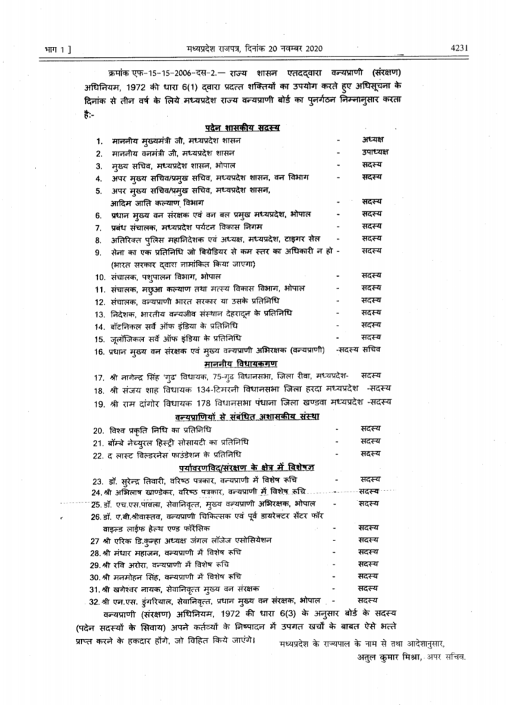 The State government on 20 November 2020 reconstituted the State Wildlife Board. This action had been necessitated since veteran journalist Lalit Shastri, who is also a leading environmentalist, conservationist and wildlife documentary maker, has challenged in Jabalpur High Court (WP 17484/2019) the formation of the (now disbanded) Wildlife Board constituted in 2019 by the previous Kamalnath government on the ground that the notification was illegal as the statutory requirement was not followed while nominating 10 members under the relevant provision of The Wild Life (Protection) Act, 1972. Section 6 (1) (e) of this Act, introduced with the Wild Life (Protection) Amendment Act, 2002 that came into force in 2003 and substituted Section 6 (1) (h) of the Principal Act clearly states “ten persons to be nominated by the State from among eminent conservationists, ecologists and environmentalists including at least two representatives of Scheduled Tribes”.